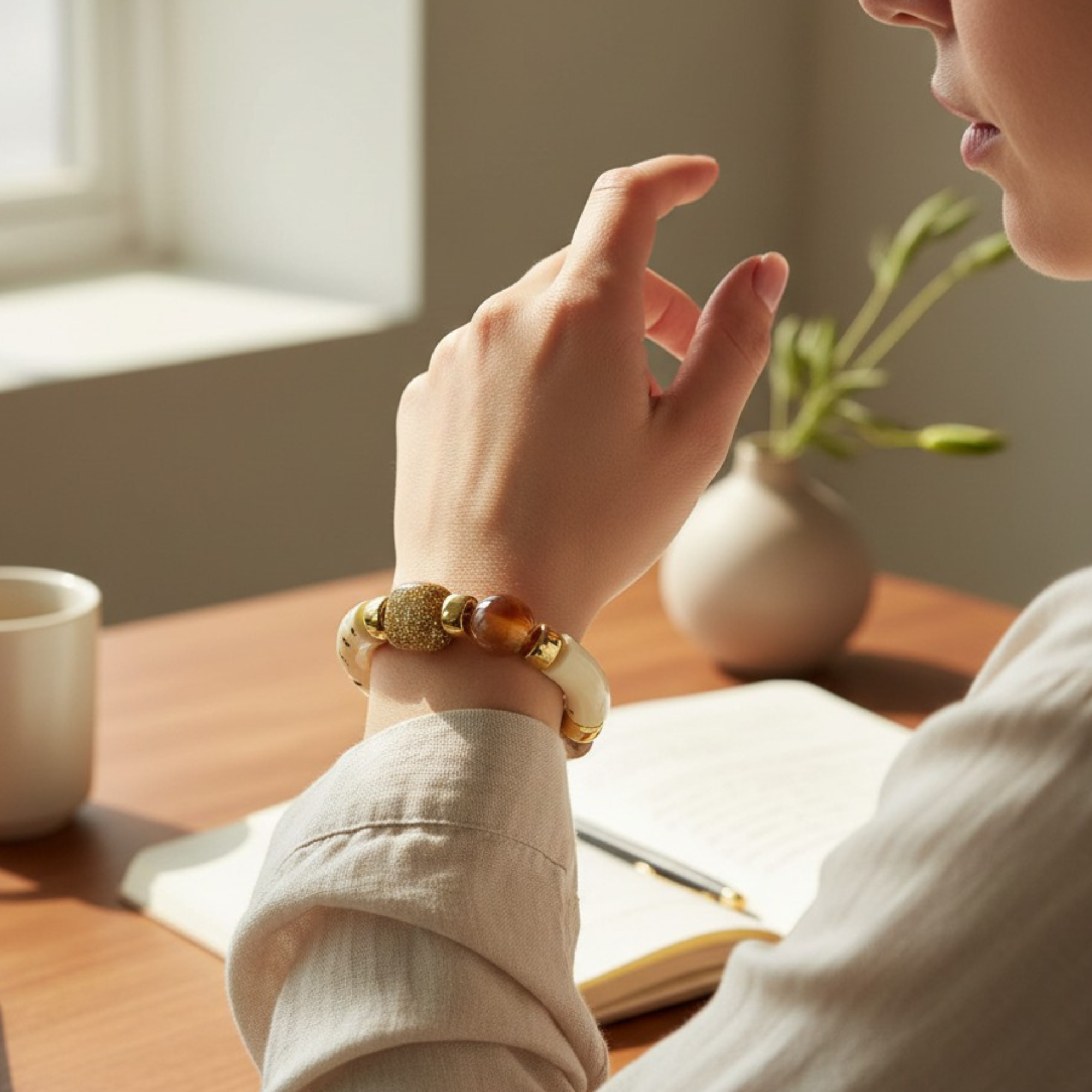 Bracelet élégant en perles d’acrylique ivoire et nude, rehaussé de séparateurs en CCB doré. Une pièce chic et légère qui apporte une touche sophistiquée à toutes vos tenues. S'adapte à toutes les tailles avec son fil élastique.
