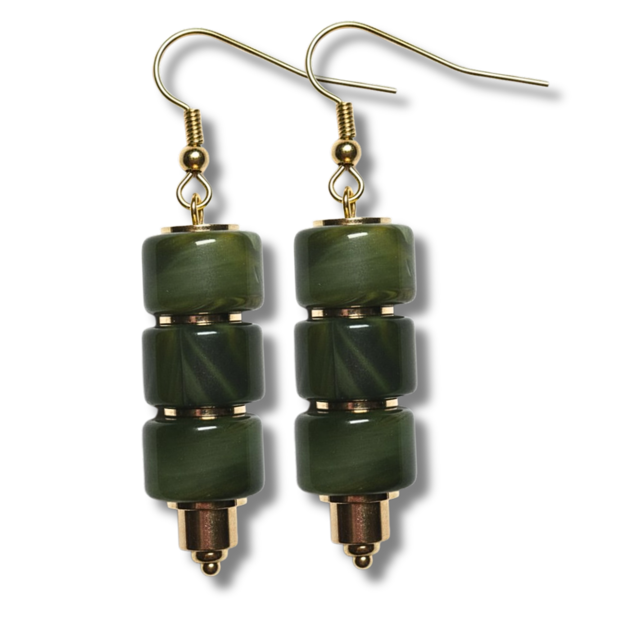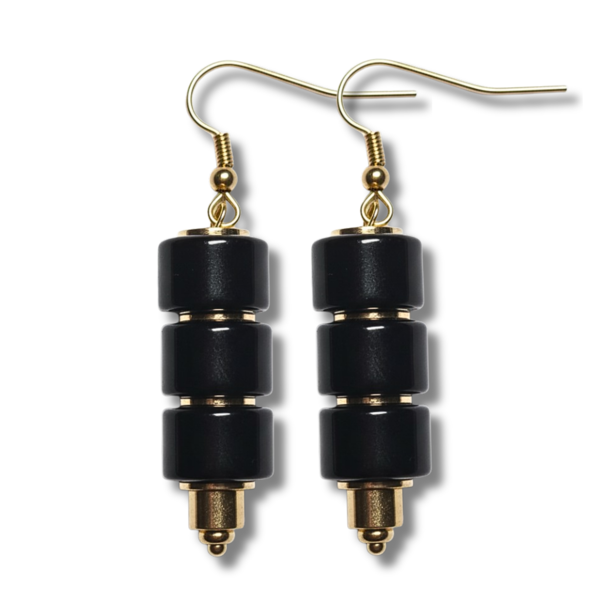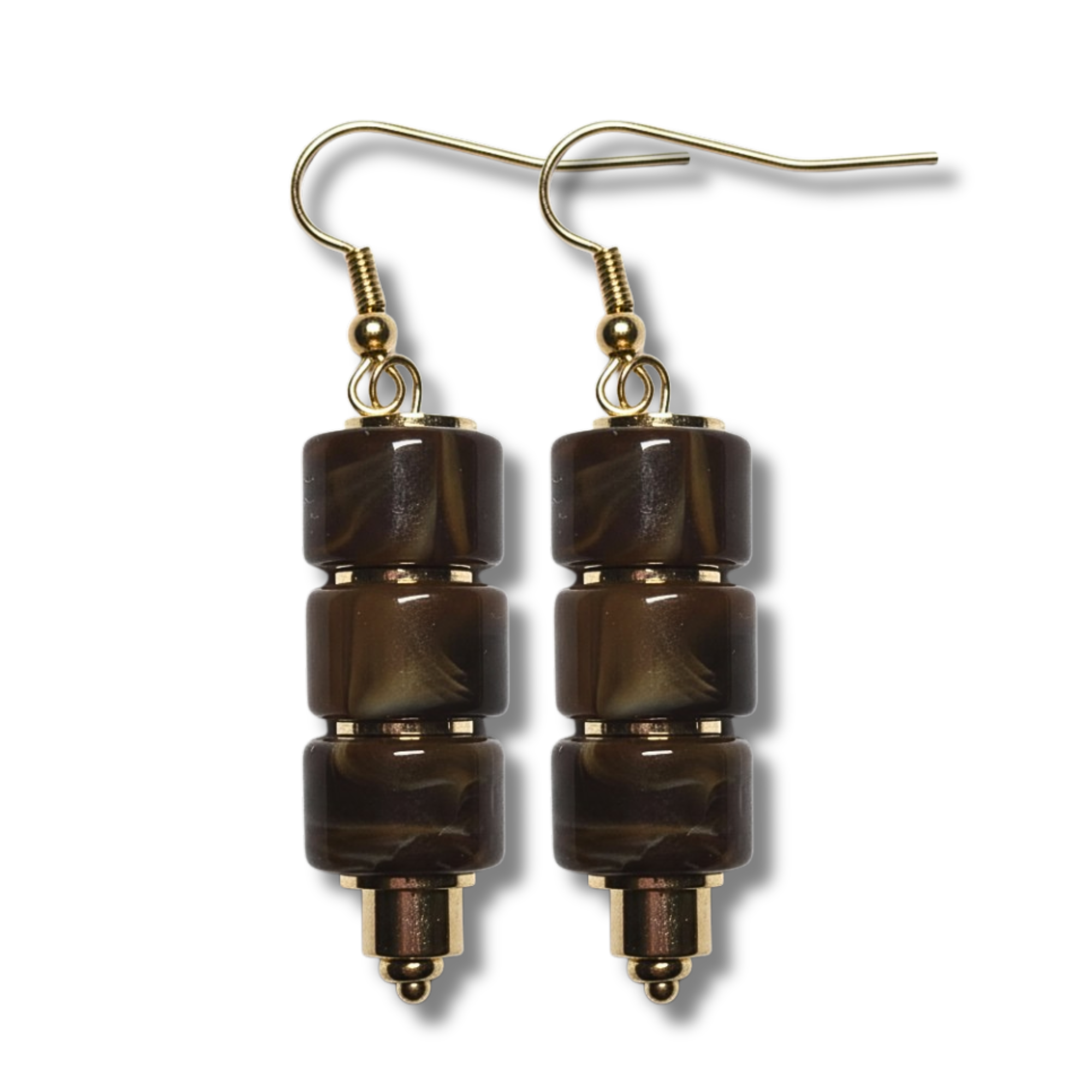 Boucles d’oreilles au design graphique et moderne, composées de perles cylindriques et rehaussées de délicats accents dorés. Déclinées en plusieurs teintes profondes et lumineuses, elles allient caractère et élégance. Un accessoire audacieux qui apporte une touche contemporaine et sophistiquée à toutes vos tenues.
