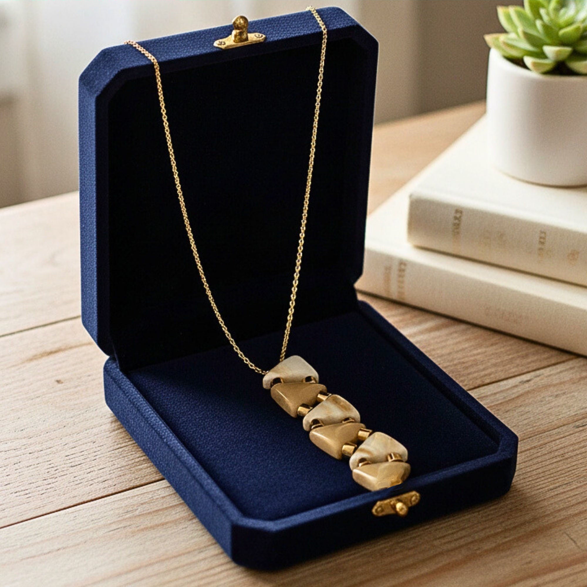 Ce collier se distingue par son design graphique et épuré. Les éléments triangulaires alternent entre des tons nougat lumineux et chocolat, séparés par de délicates touches dorées. Suspendu à une fine chaîne doré inoxydable, il apporte une élégance naturelle et contemporaine, idéale pour sublimer une tenue sobre comme plus habillée.