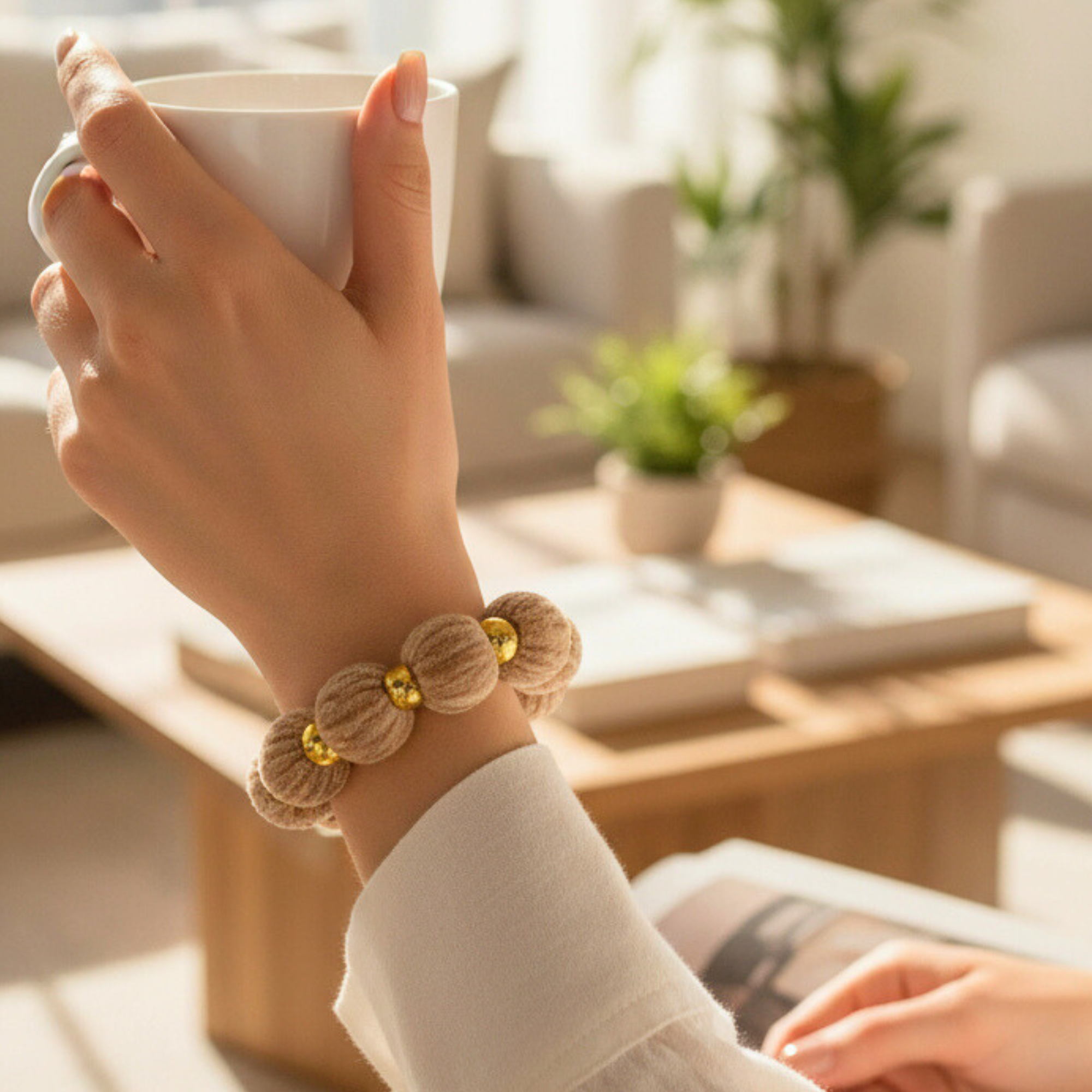 Doux, léger et plein de charme, ce bracelet chouchous en laine de chenille apporte une touche chaleureuse et raffinée à votre poignet. Ses perles texturées, délicatement séparées par des accents dorés, offrent un subtil équilibre entre confort et élégance. Monté sur un élastique résistant, il s’adapte facilement à toutes les tailles et se porte aussi bien au quotidien que pour sublimer une tenue plus habillée. Un accessoire cosy et tendance, parfait pour ajouter une note de douceur à votre style.