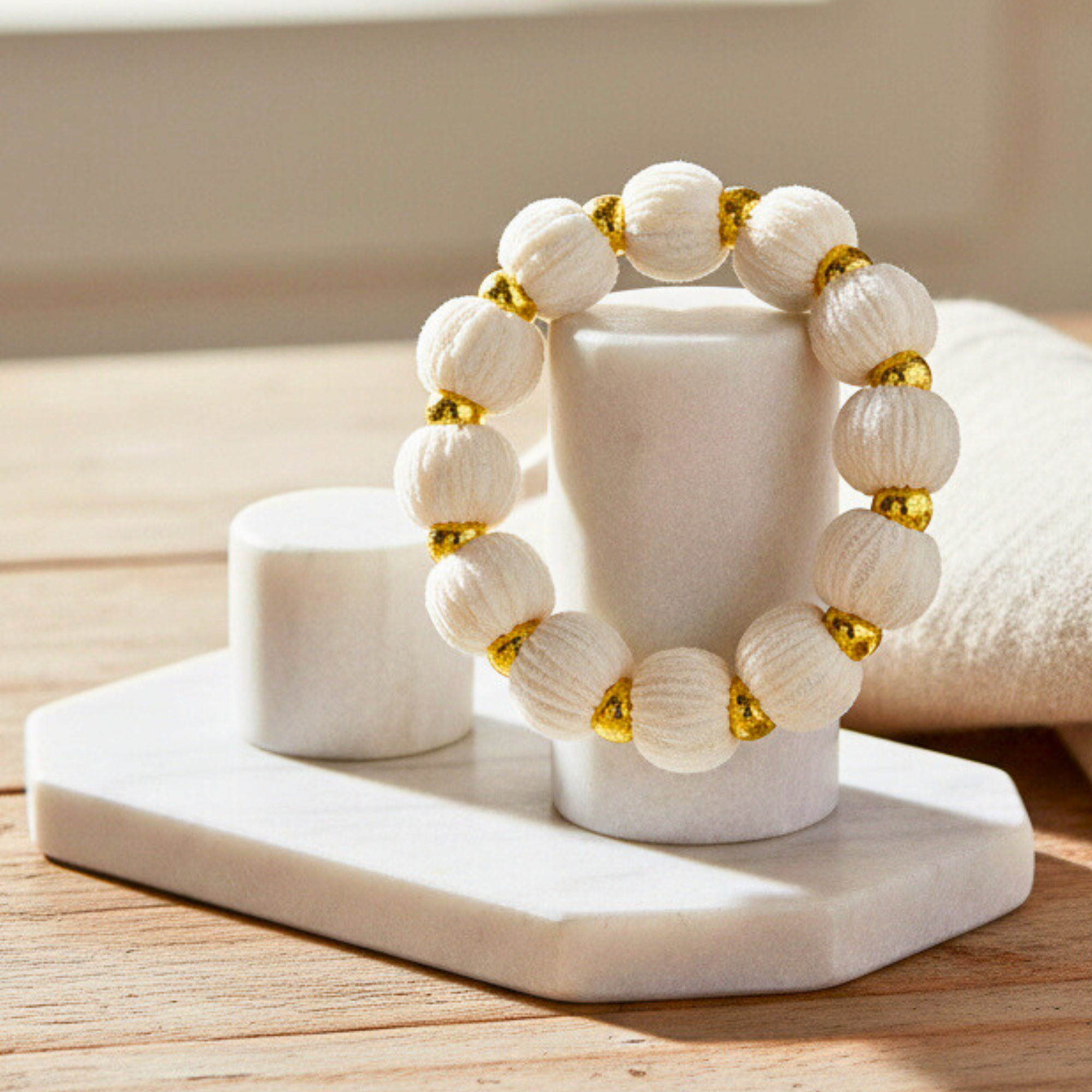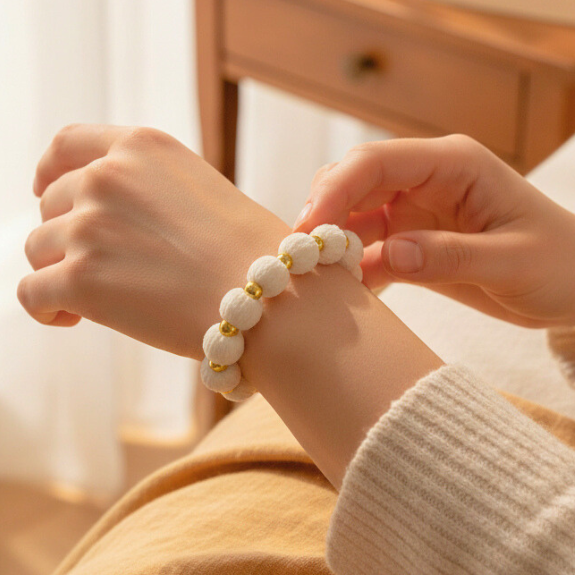 Doux, léger et plein de charme, ce bracelet chouchous en laine de chenille apporte une touche chaleureuse et raffinée à votre poignet. Ses perles texturées, délicatement séparées par des accents dorés, offrent un subtil équilibre entre confort et élégance. Monté sur un élastique résistant, il s’adapte facilement à toutes les tailles et se porte aussi bien au quotidien que pour sublimer une tenue plus habillée. Un accessoire cosy et tendance, parfait pour ajouter une note de douceur à votre style.