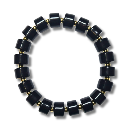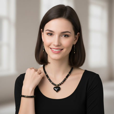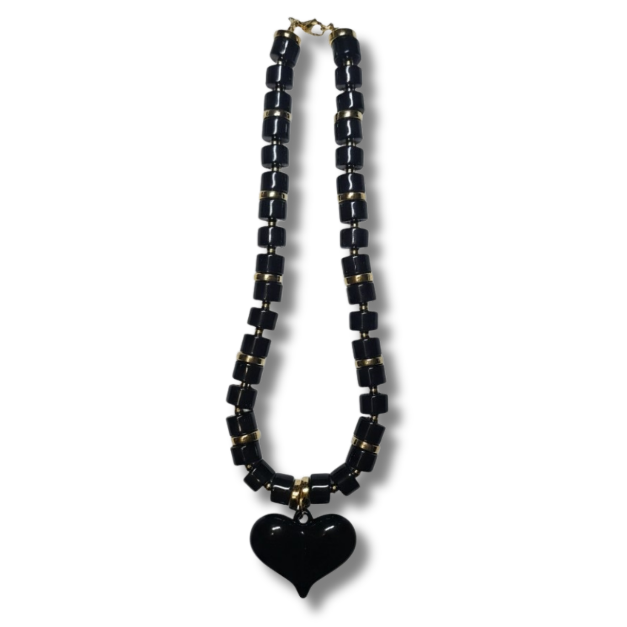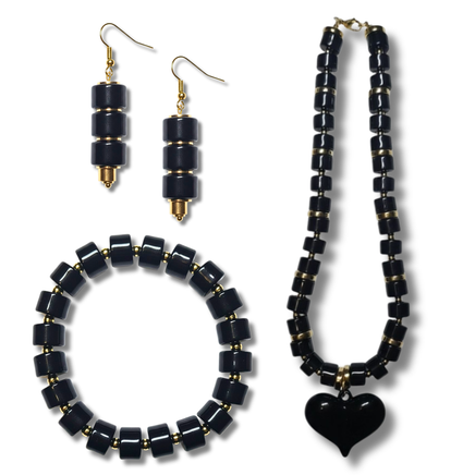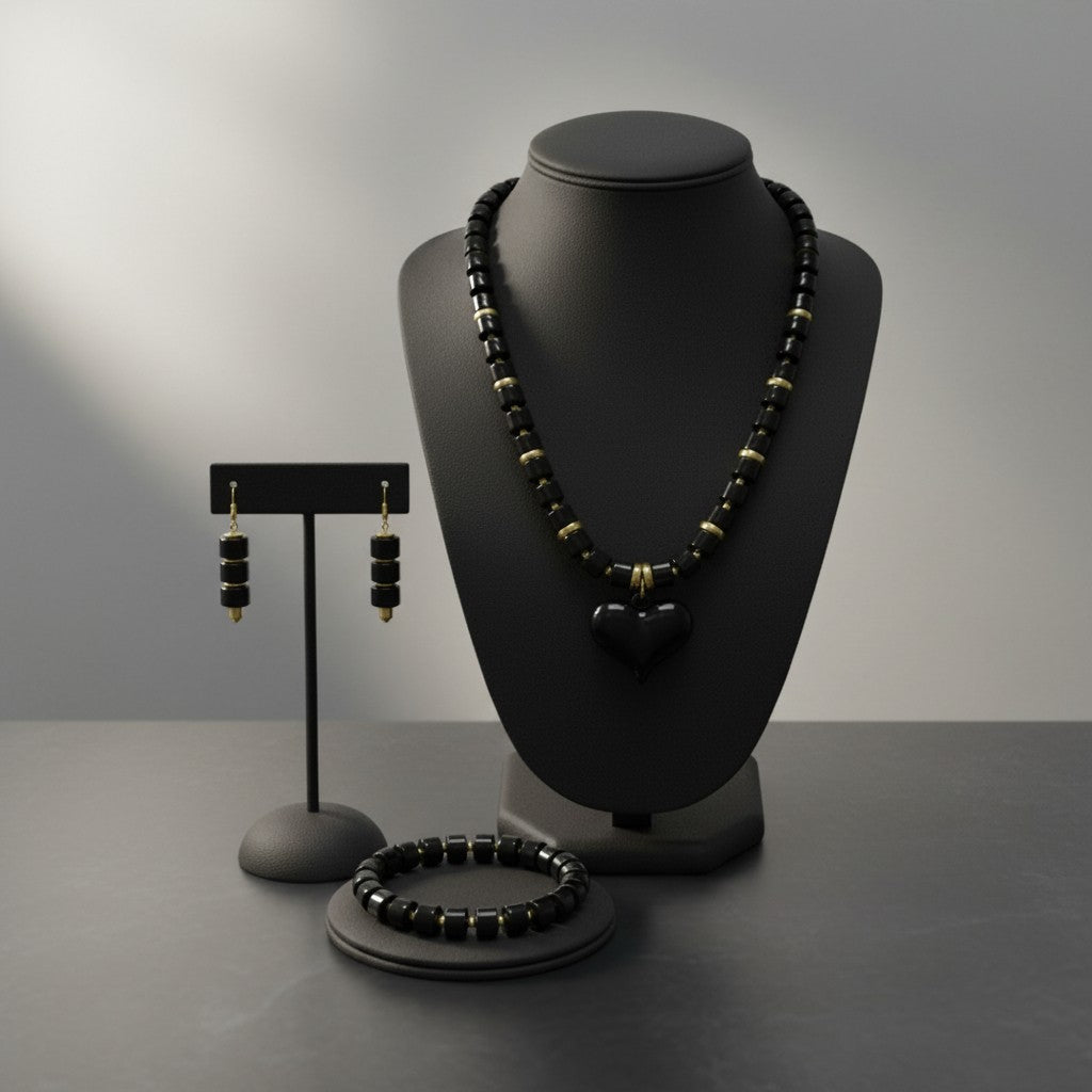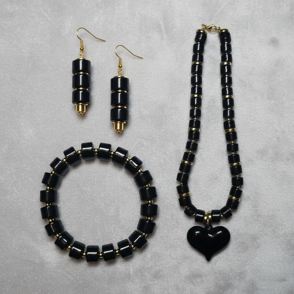 Ensemble de bijoux au charme chaleureux, composé d’un collier, d’un bracelet et de boucles d’oreilles assortis. Les perles cylindriques noir, rehaussées de touches dorées, offrent une harmonie douce et naturelle. Le pendentif en forme de cœur ajoute une note tendre et raffinée. Un trio élégant, idéal pour sublimer vos tenues avec une allure authentique et intemporelle.