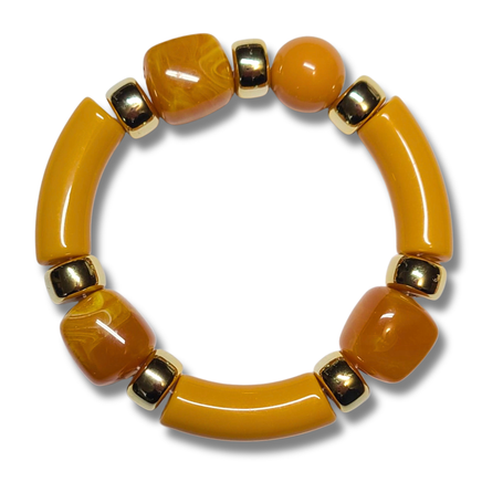 Bracelet élégant en perles d’acrylique mangue, rehaussé de séparateurs en CCB doré. Une pièce chic et légère qui apporte une touche sophistiquée à toutes vos tenues. S'adapte à toutes les tailles avec son fil élastique.