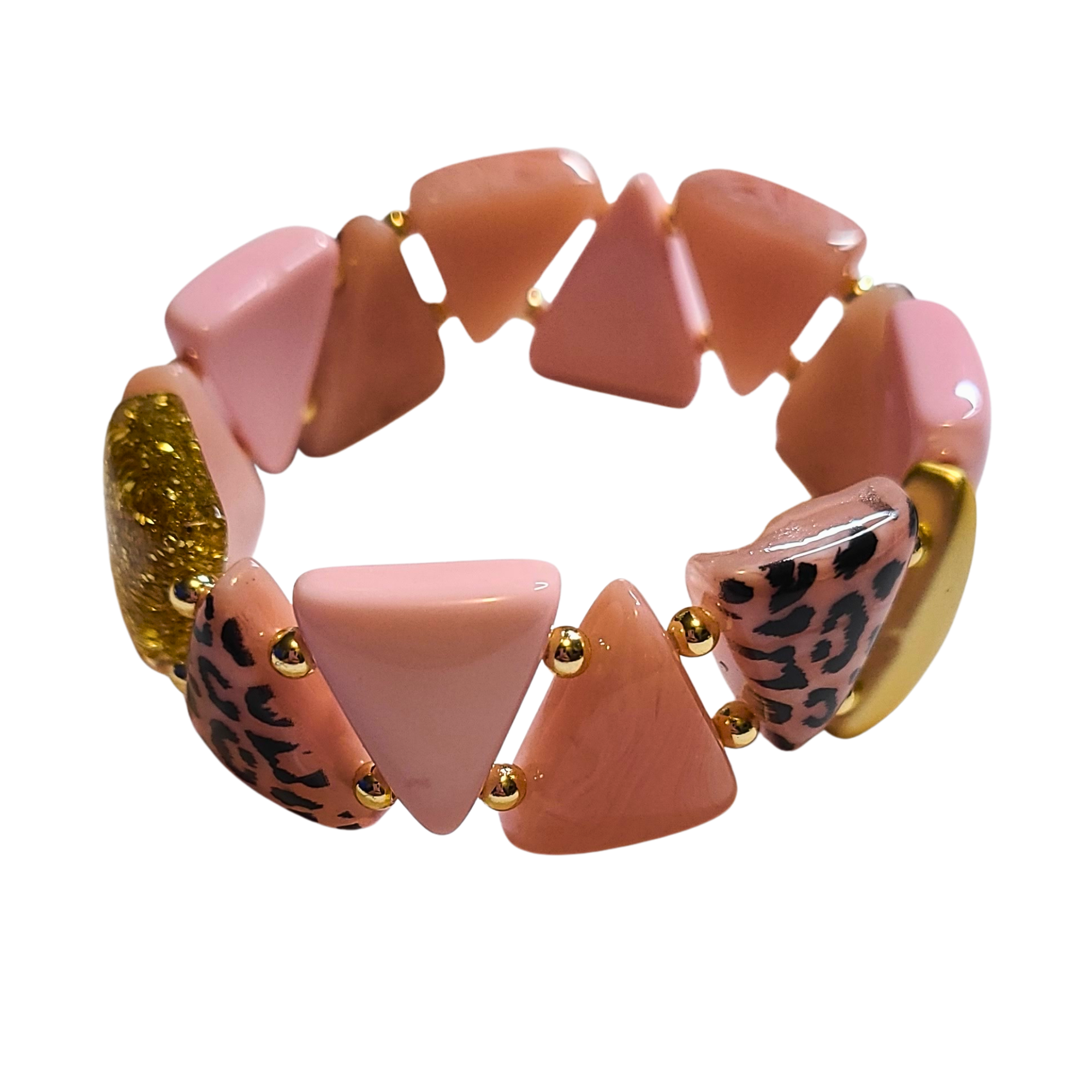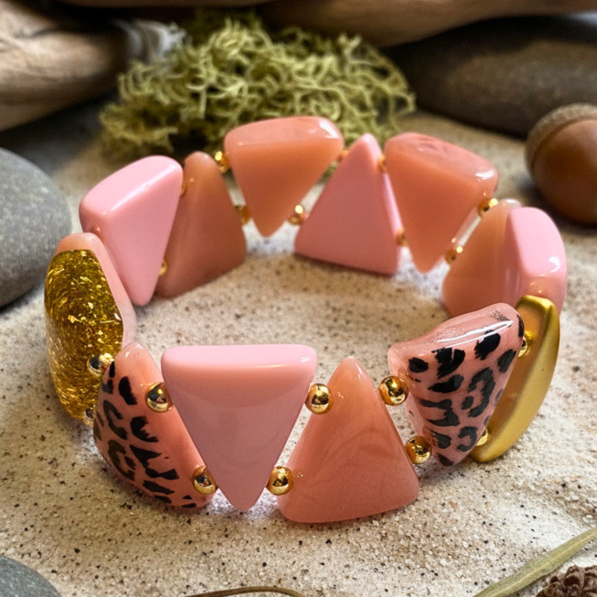 Élégant et solaire, le bracelet triangle rose doré léopard se distingue par son design géométrique en acrylique.