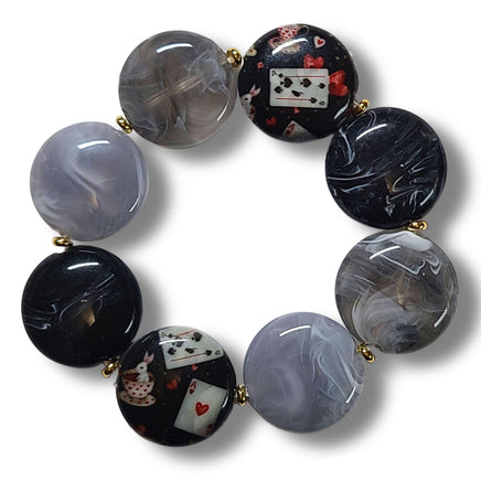 Bracelet élastique composé de palets ronds et plats en acrylique léger, thème noir marbré ultra tendance.