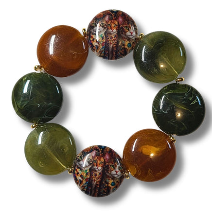 Bracelet élastique composé de palets ronds et plats en acrylique léger, thème chat et vert