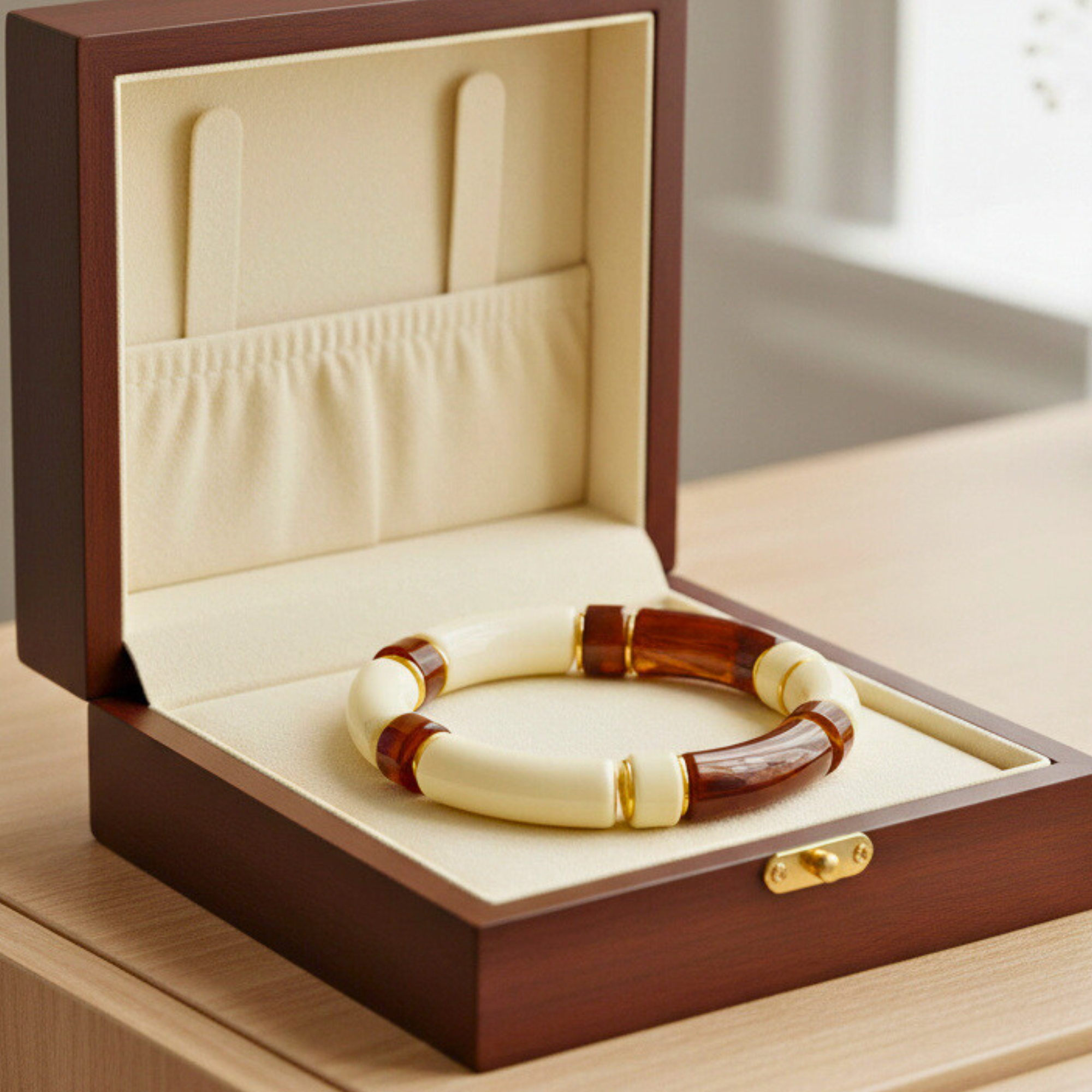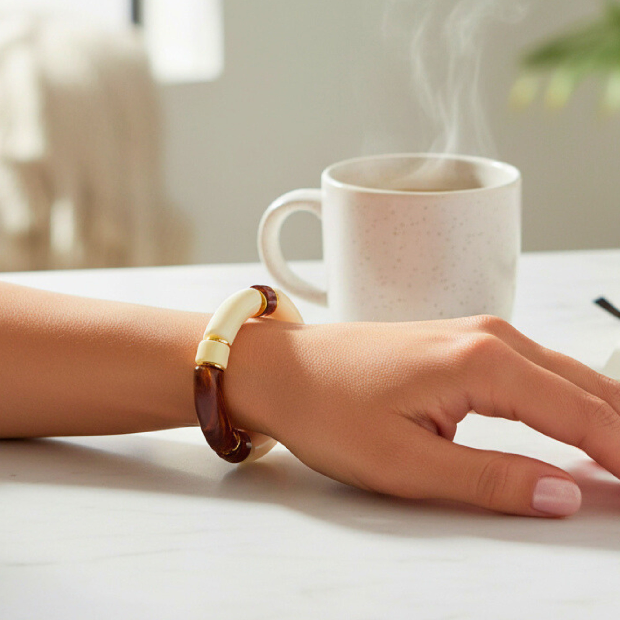Bracelet élégant en perles d’acrylique caramel. Une pièce chic et légère qui apporte une touche sophistiquée à toutes vos tenues. S'adapte à toutes les tailles avec son fil élastique.